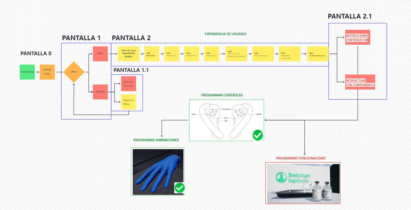 I created this easy-to-share map of the VR app for the client and made notes of all the components required for each stage live during the development process. My services included regular video updates of the development process and documenting each step.